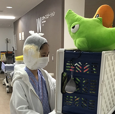 前回の入院時にスタッフをメロメロにしていった患者様です。今回もほかの入院患者さんのハートまで射抜いていました!!OPEの予定がない日があり、手術室スタッフから見学のお誘いを受けて職場体験してきたようですよ。